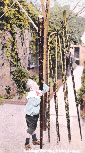 The Jersey cabbage or kale is a giant variety, once grown all over the island, but now rarely seen. The stem grows tall and straight and if cut, dried and varnished it makes an excellent walking stick. These sticks were popular souvenirs for holidaymakers, with an enamelled Jersey penny set into the head, and some are still made to this day.