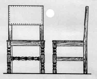 The earliest local chair seen, an oak back-stool of Jacobean character, with a studded leather seat and back-rest, belongs to an old Jersey family who believe that they have always owned it. This example, Chair 1 , is of a type which was made in England from about 1620 to 1700, but the higher cross-rail in the front frame, as well as the lower seat height, would imply a date of 1680, or perhaps the very end of the 17th century in this case.