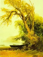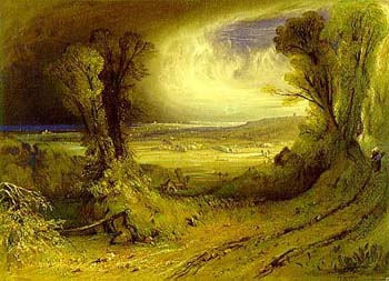 The untameable force and beauty of nature are combined in this landscape. A stormy maelstrom of swirling cloud is broken by the curve of blue sky as the sun breaks through, lighting the edge of the clouds. The central landscape is framed by two clumps of trees and lit by the emerging sun. The swirling vortex of cloud above and sunlight breaking through windswept trees, create a feeling of a landscape battered by the elements.