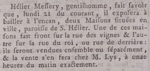 The discovery of a 1788 advert in Gazette de l'Ile de Jersey in which Helier Messervy offered two town houses for sale, one on 'rue des vignes' (Vine Street) and one on 'rue du roi, ou rue de derriere' indicates that both names were used for the street much earlier than the Roads Committee records suggest. The official name may have been Rue de Derriere well into the 19th century, but 'Rue du Roi' (King Street) was clearly in common use much earlier. And business adverts also indicate that Rue de Derriere was used for Queen Street, confirming that both streets were officially renamed at the same time, after the relative monarch and his queen.