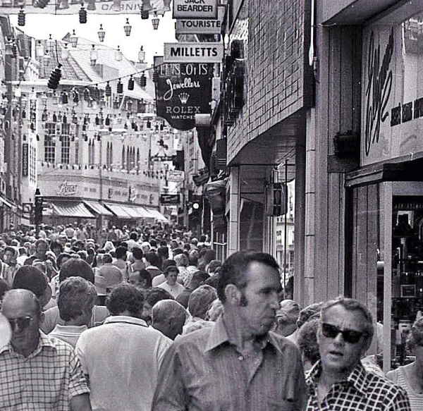1971, shortly after the street was closed to traffic. Marcel Jacques is No 17, with the lower odd-numbered properties stretching beyond. It used to be possible to walk through from King Street to the Royal Square in a covered walkway between Nos 15 (Linscott's in this photograph) and 17, but that has since disappeared with redevelopment