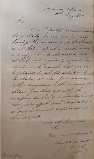 On 8 May 1827 the Lieut-Governor of the day, Major-General Sir Colin Halkett, a hero of the Battle of Waterloo, who had held his Jersey office since 1820, wrote to the recently appointed Bailiff of the day, Sir Thomas Le Breton, to point out that the absence of clearly visible street names and a numbering system for properties resulted in 'much public inconvenience being daily experienced' and politely, but nevertheless firmly, suggesting that Sir Thomas raise the matter at the next sitting of the States. Perhaps Sir Colin was motivated by events two years earlier, when Halkett Place, named in his honour, was opened, but without any numbering of properties. It had previously been known as Market Street, according to an 1800 plan for the old Government House on the corner with King Street, which Sir Colin decided was not fit for him to live in.