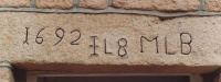 Above the accolade of the third window is an incised cross. To the left of the doorway, which is offset to the right of the second window on the first floor, is a narrow additional window with plain reveals. The front door is straight lintelled, without a chamfer, inscribed 1692 ILR MLB.