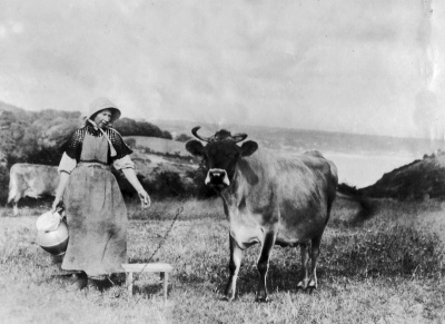 Jane L'Enfant with a family cow in about 1900