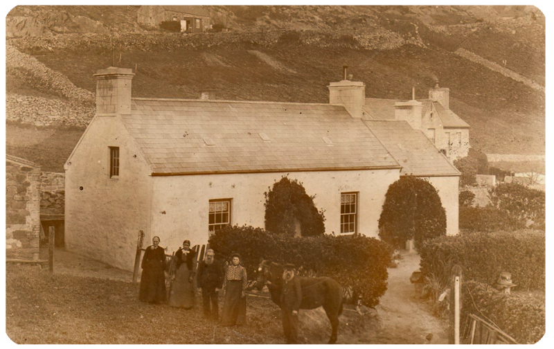 A closer view of the same, typical Jersey, granite cottage - picture believed to be by Albert Smith. The cottage has the datestone 1753 IHB ♥ ELGL for Jean Hubert and Elizabeth Le Gresley