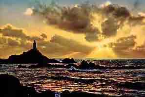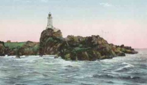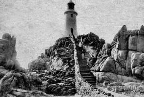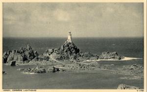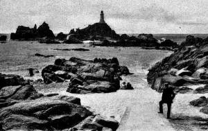 - "On St Catherine's Day, 1495, five Spanish caravels were driven on these rocks, and the sand-storm which destroyed the fertility of Les Quennevais was attributed by tradition to God's wrath at the cruelty shown to their crews, And so the dismal tale went on throughout the ages. At last, in 1873, a lighthouse was built by the States. Imrie Bell, the engineer, chose an isolated rock 500 yards from the shore. On this he placed a concrete platform 9 feet high, and a tower 35 feet high on the top of that, the first lighthouse in the British Isles to be built of concrete. The light, which is now electric, can be seen for 18 miles.