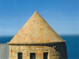 - 'The building has a parabolic plan form and vaulted roof - all in dressed granite. The gutters are also cut from granite and curved to match the shape of the walls. The building appears to be two-storey but the lower part is built over an outcrop, leaving a single upper room accessed via the roof level of the guardrooms. A large granite buttress supports the east side of the magazine. There are small ventilation holes around the building. Larger windows of concrete construction have been inserted on the south and west faces of the building. The walls forming the battery are granite rubble with dressed stones to openings and steps, and a granite flagged floor.