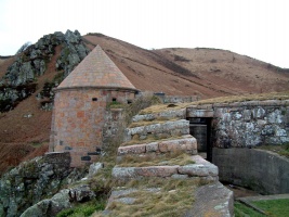 - 'The 1834 entrance doorway is raised at second floor level and flanked by a short screen wall with gun loopholes. The doorway leads to a flat platform supported off the brick soffits of the guardrooms below. The guardhouse is single storey and comprises three vaulted rooms. The walls are granite with dressed stones to openings. The arched vaults are in brick. The original doors and windows have been lost. A granite-flagged passageway runs along the north face of the guardrooms. A door and window have been punched through the back wall of the middle guardroom to provide access to the new 'ditch' rooms. A wide set of granite steps leads up from the guardrooms to the battery yard - although now partly interrupted by a later German structure. Adjoining to the east of the guardrooms is the magazine.