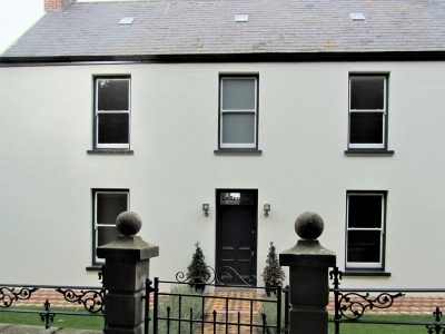 Late 19th century, upgraded 21st century. Set back from road behind small front garden bounded by low granite walls with iron railings and granite piers with ball finials. Two storeys plus attics and basement, three bays with single storey conservatory extension to west and porch extension to east.