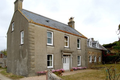 2 storey, 4 bay house. Front (south) elevation: slate roof with stone chimney on west gable only. Random stone construction with sturdy quoins, and dressed stone openings 19th century. Rear (north) elevation: slate roof. Small random stone construction with pierre perdu mortar. Wide central chamfered stone entrance door (now blocked) with a matching window above and a small vent opening at the east gable.