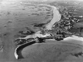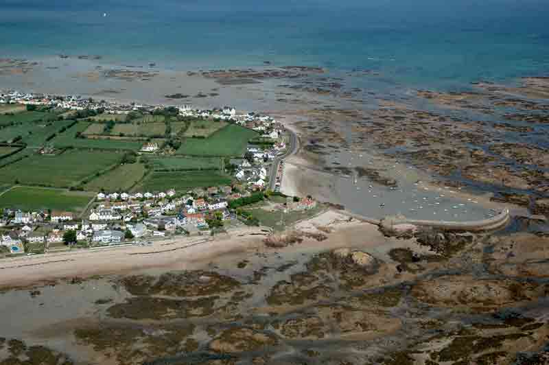 La Rocque, at the south-east corner of the island, was once one of only two centres of population on the east of Jersey, the other being Gorey. In between lay only farmsteads. Today the whole coastline from St Helier to Gorey is developed, with very few open spaces, as can clearly be seen in the photograph on the left. At La Rocque the road meets the coast, overlooking the small harbour. This was a refuge for fishing vessels from the Middle Ages, although no jetty was built until the 19th century.