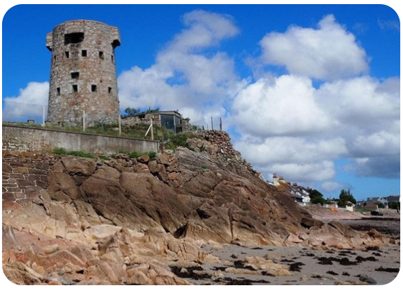 La Rocque Tower, otherwise known as Grouville Bay No 1, lies on the shoreline at the southern end of the bay, one of a chain of eight defensive installations along its length.