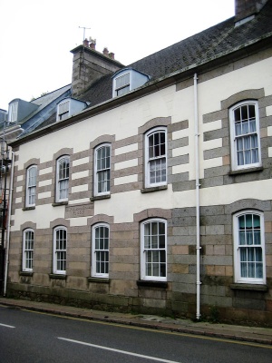 Two-storey, nine-bay, former hospital building comprising two phases, the westernmost being the earlier (approx 1757-1770). This phase is of five bays with pitched slate roof with two large chimneys. The four-bay later phase to the east has been constructed to match the older building, although the detail is less refined. The granite string-courses were omitted and the dressed granite infill at ground floor is substituted for unpainted stucco, mixed to match the colour of the stonework.