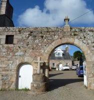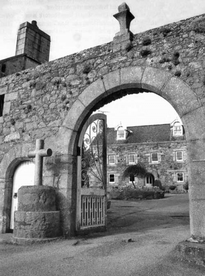 The round arch doorway of the main house can be dated to the 16th century, but the cylindrical cross base and cross nearby are reproductions, of no great antiquity.