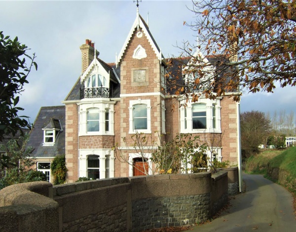 Main house with additional gabled porch turret, two large decorated gabled-dormers with French-doors and wrought-iron enclosures. Chimneys with header-decoration. Rusticated stone construction with dressed quoins and decorated two-storey bay window openings.