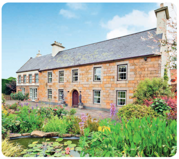 Two-storey, irregular five-bay house with 20th century wing to west, and extensive buildings to north.