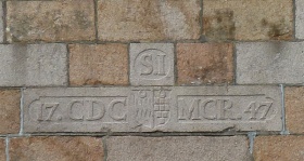 Arch with wide concave chamfer and chamfer stops may date from 1609, windows heightened and gable stone removed in 1747.