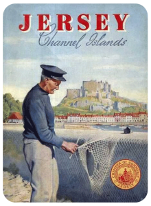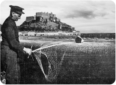 This photograph of fisherman Thomas Le Huquet mending his net at Gorey was taken by the Germans early in the Occupation to be used for propaganda purposes, showing how islanders were going about their normal activities after Jersey was invaded. It was put to further use by Jersey Chamber of Commerce after the war ended, in colourised form, to promote the island's tourism industry