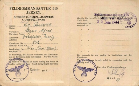 Curfew pass issued to Edgar Le Quesne during the Occupation as a member of the Honorary Police [1]