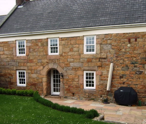Fleur de lys chamfer stops. Façade of good dressed stones. Although much extended, original is smaller type house with one window on each side. Present windows enlarged.