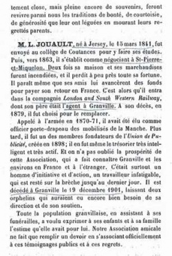 - "I came across an obituary in the St Lo archives from the Coutances College book. He was actually a flag bearer for the Manche region. The French did not fight well and it was a bit of a disaster. I do find it interesting that a Jersey born person should fly the flag for France. Louis went to Granville with his father Julien when he was aged about 13 or 14. Julien was born in Granville but had also become a British citizen. This may have been because he owned vessels and you had to be British to own British vessels, hence some of the boats were registered in his wife's name - Jane Wimbee. In Louis's obituary it mentions he had worked at St Pierre Miquelon, a French territory in Canada, but his house burnt down twice. This is most likely where he knew the Riotteau's from. They were a Granville family that made their considerable fortune in St Pierre Miquelon. Emile Riotteau became a successful French politician and it was his son that married Louis's daughter Madelaine. She died on hoiliday when the hire car she was in that had faulty brakes (which were supposed to have been fixed) overturned on L'Etacq and she was crushed and died the following day in 1938. They had two daughters who were best friends with Christian Dior and they both went on to Paris. I recently made contact with the grandson of one.