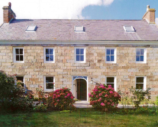 The main two-storey five-bay farmhouse has a two-storey wing to the northeast and a 20th century two-storey porch to the northwest. Detached two-storey L-shaped building, with single storey section to west, sits across yard to north. Running north/south to west of yard is a two-storey converted barn. At the north end of this barn is a detached single storey cottage. 20th century garage detached to west of barn. Avenue running west from barn to gateway on to Rue es Philippes.