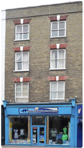 Four-storey, two-bay. Hipped roof obscured behind parapet. Wall brick with string course at gutter level. Window brick lintels have prominent keystones.