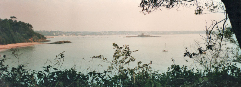 The second path continued from this red camelia to the Three Pines, then beneath these and out onto the farmland above the manor, a reminder that all seigneurial land was in earlier times farmed from the manor and its own outhouses. Manor Farms built at a distance from the manor, were in Jersey, characteristic of Victorian times, the Warren Farm being an example, having been built as such. This particular manorial land was the flat land from the top of that slope towards the Old Portelet Inn and included land extending to the heights above Noirmont Point. Half of this high, flat, land was cultivated, the other half uncultivated, by reason of there being insufficient depth of soil. This was La Varenne, or The Warren. Here the owner of the fief and his guests went on rabbit shoots, obtaining the occasional woodcock, whilst along the treeline, there was good pigeon shooting. The seigneur`s pond, or vivier, where, in medieval times, the monks kept carp, is situated within sight of L`Ile Percée, to the west of Noirmont Point. Once well-maintained, it has now all but silted up.