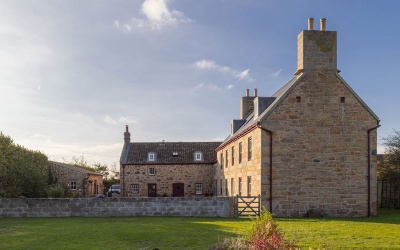 Adjoining the west gable of the house, forming L-plan, is a two-storey range of farm buildings in rubble stone. It is likely that this range was originally single-storey and has earlier origins than the main house. The south-east corner of the building is formed from large blue-grey stones and the granite in the lower sections appears to be of significant age - perhaps 17th century.