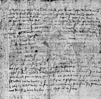 In the year of grace 1463 on the Monday immediately preceding the feast of the Annunciation of Our Lady (March 21) were present in the hearing of the parish of St Lawrence, Nicolas Le Moigne and Jennete, his wife, of the one part, and Colin Le Cornu and Perete, his wife, of the other part, which Jennete with the authorization of her said husband, leased, ceded and surrendered in perpetuity for herself and for her heirs to the said Cornu and to his said wife to the survivor of them and thereafter in perpetuity to the heirs of the said Cornu, to wit, the house and holding of Le Hurel, formerly inhabited by Johan Le Moigne, together with the fields above the said house and the field before it, the verges, valleys and slopes as the said fields are situated, together with three vergees ofland or thereabout situate along the road by which .... .... goes to the Church towards the north to the .... .... of the big field above the said house and holding; and the said lease was made for the price of six and a half quarters of wheat rente and the said wife bound herself, with the authorization aforesaid, for herself and for her heirs to assure and guarantee the said lease free and exempt from all rentes and encumbrances, from prevoté, from sergenté, from servage, from fumage and from suit at mill and from every other servitude whatsoever to the said Colin, wife and heirs .... .... on penalty of all her movable and real property present and future and she promised on the faith of her body that she will never act against the above-mentioned by claiming wrongful alienation of her marriage-portion or otherwise.