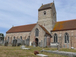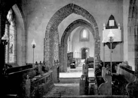 The church is known to have existed before 1198 and is stone vaulted with a tile roof. It has a Norman saddleback tower with a cross at the apex of each gable and Norman windows on each side at top floor level.