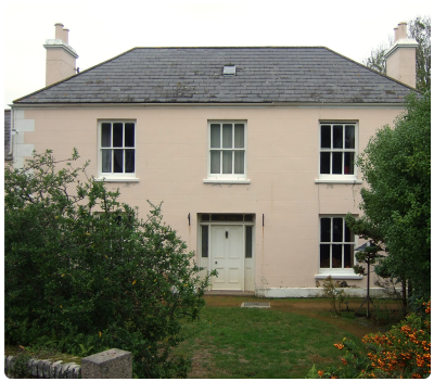 Two-storey three-bay main house with earlier building abutting to west, a dower wing to east and rear outbuildings.