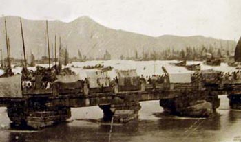 To get to the Chinese city one had to cross a short bridge to a small island covered with native houses, and then by a long bridge over a very wide branch of the river. The bridge is, in a flowery language of the Chinese, called the “Bridge of Ten Thousand Ages”. It is a very solid structure with piers of granite about ten feet apart, the roadway being made of large stones some sixteen feet long by three foot square, laid from pier to pier, not arches. It must have been a great work constructing this bridge and bringing from the quarries and placing in position these immense blocks of granite, and the piers must be very strong to withstand the fushets and floods which come down the river in spring.