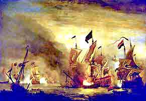 Royal James catches fire at Solebay in 1672, taking the life of Lieut Carteret