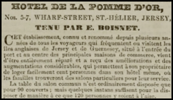 - "Mme Veuve Boisnet a l'Honneur d'informer Messieurs les habitants de cette ile et Messieurs les voyageurs qui frequent les iles Anglaises qu'ils trouveront dans son establishment justement renomme bonne table d'hote a 10 et a 5 heures. Salons particuliers pour les familles et toute les comforts desires. Messieurs les voyageurs de Commerce trouverone tous les renseignements, et de bons magazins pour merchandises. Mme Boisnet a toujours dans cette le Magazin de Commerce trouveront tous Francais et de l'absinthe en gros et en detail." (The widow Mrs Boisnet has the honour to inform the residents of this island and visitors who frequent the English islands that they will find a renowned meal at 10 am and 5 pm. Private rooms for families and all comforts desired. Commercial travellers will find every advice and good shops for their goods. Mrs Boisnet always stocks everything French and absinthe in bulk and for retail.)