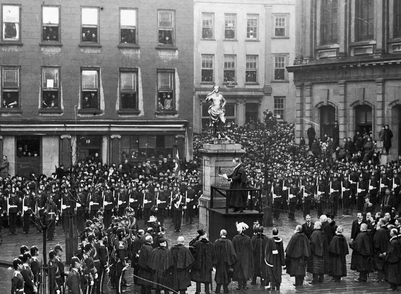 The procession took a circuitous route to the Market Square (not yet renamed the Royal Square) proceeding via Snow Hill, Queen Street and King Street to Charing Cross, where the old prison straddled the road, Broad Street and what is now Library Place, to enter the square next to the Town Church before drawing up in front of a pedestal where the statue of George II now stands.