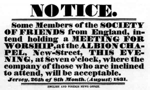 It was the members of the Guernsey Meeting who initiated a revival of Quakerism in Jersey at the beginning of the 19th century, by calling on English Friends to advertise a Meeting to be held, for all those interested, at the Albion Chapel, New Street, Jersey.