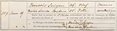 Francois Sangan married Marie Louise Soudain in St Peter in 1879. Francois was a widower. In about 1890 he and his wife moved to Guernsey with their three sons, John (1880- ), Frank (1882- ) and Peter (1884-1966). Francois died shortly after from injuries received in a farming accident in Jersey