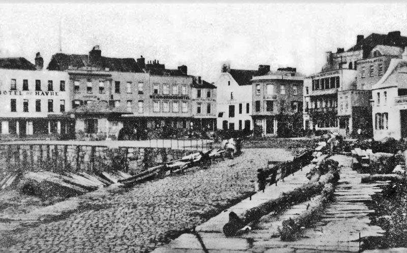 The date may well appear on the facade of the hotel, but Mr Ahier was not the first historian, nor will he be the last, to confuse a datestone on a building with the year of its construction. The hotel was almost certainly in existence three years earlier, because it is shown in the 1861 census, with Thomas Purkis as 'hotel keeper'. The address of the hotel is given in the census as 1 Esplanade/5 North Pier, which appears to be a correct description of the site on the corner of the Weighbridge and Esplanade. The adjoining Pomme d'Or Hotel is not named in the census but the previous entry is for 2-3 Esplanade and 11, 13, 15, 17 and 19 Conway Street, which coincides with the location of that hotel.
