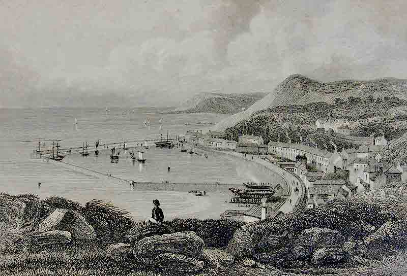This picture, which was Jerripedia's Picture of the week in July 2011, shows St Aubin in the 1840s. It was also used as a cover picture for the 25th anniversary edition of the Channel Islands Family History Journal No 100, in October 2003. It is a magnificent drawing, showing the little port of St Aubin before the arrival of the railway from St Helier in the autumn of 1870, when shipyards occupied the area where the railway terminus was to be built. The row of fine houses along the Bulwarks had already been in existence for nearly 100 years. They were built by prosperous merchants at a time when St Aubin's harbour was far more important than St Helier's, but by the middle of the 19th century the roles had reversed and few if any vessels discharged their cargoes at St Aubin. Although Gorey, Havre des Pas and the eastern end of St Aubin's Bay are probably better known for their shipbuilding activities, the largest vessels were built at St Aubin. Scottish shipbuilder Edward Allen, who owned a house on the quay, built the 747-ton Evening Star, the largest ship built in Jersey, in the yard which can be seen in the picture behind the outer jetty, which was completed in 1819. THe ship was launched in May 1854. Many shipwrights lived in the growing town of St Aubin, including Philip Hocquard, John Poingdestre, George Jeune, Nicholas, Elias and John Briard, Abraham Le Brun (father and son), Thomas Leigh and Thomas Land. Jean Le Bas, who commissioned the vessel, ws its master on its maiden voyage to Australia in August 1854 with 200 emigrants. This was one of only four direct emigration voyages from Jersey, and some of the emigrants are known to have worked on the construction of the vessel to earn money to pay for their passage.