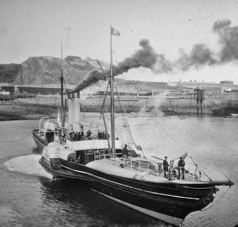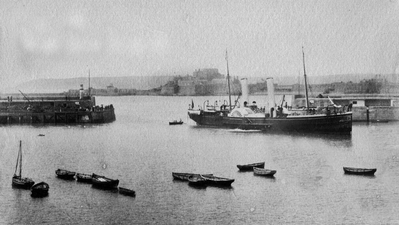 A paddle steamer, probably Brittany I, enters St Helier Harbour ...