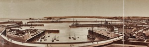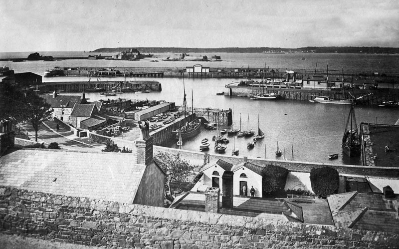 English Harbour, 1860s. Note that the breakwater from Elizabeth Castle, in the background, has yet to be constructed