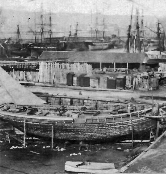 An early photograph of the La Folie area, from a 19th century stereo pair. It is not clear whether the vessel in the foreground is under construction or undergoing repair - probably the former because this was an area where a limited number of ships were built