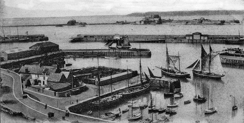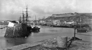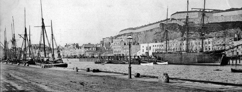 A panoramic view of the Old Harbour with Gladiateur , a vessel built in Jersey, moored in front of Commercial Buildings