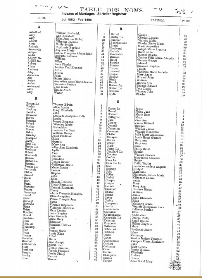 These are images of Register Office indexes of St Helier non-Anglican marriage registrations, covering weddings in non-Anglican churches and the Registry Office. They are provided in this form because this is all that is currently available online. We do not currently have the necessary resources to create a full index for the individual records. You can estimate the date of the marriage more accurately by referring to the page numbers for records in each set. Lower page numbers are at the beginning of the date range, higher numbers at the end of the range. The index does not combine groom and bride to provide a full marriage record, but if you identify one party, the other will appear on the same page.