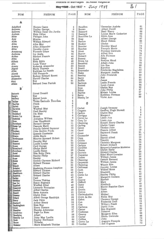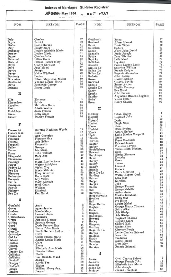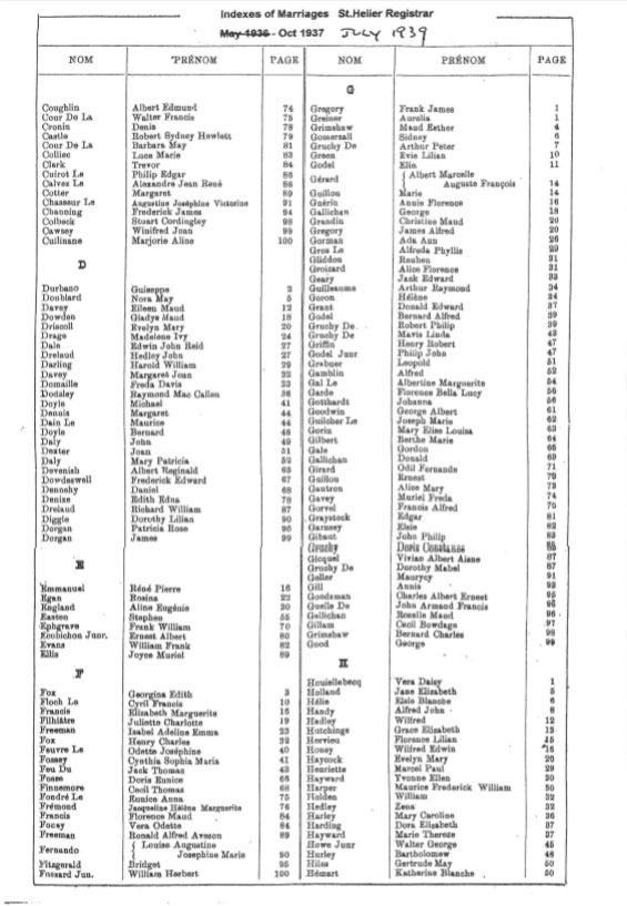 These are images of Register Office indexes of St Helier non-Anglican marriage registrations, covering weddings in non-Anglican churches and the Registry Office. They are provided in this form because this is all that is currently available online. We do not currently have the necessary resources to create a full index for the individual records. You can estimate the date of the marriage more accurately by referring to the page numbers for records in each set. Lower page numbers are at the beginning of the date range, higher numbers at the end of the range. The index does not combine groom and bride to provide a full marriage record, but if you identify one party, the other will appear on the same page.