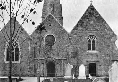 Examining the windows on the south side, an arrangement is found which exists in several of our churches, viz a large window with mullions at the east end and two smaller ones. The larger window is moulded and surmounted by a finial, the two smaller ones were not mullioned originally. All the windows have dripstones. The west entrance is formed by a depressed arch, possibly not the original one, its gable terminating in a grey stone cross.