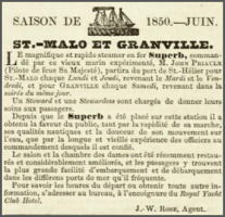 The beautiful iron steamer Superb (which plied between Jersey and France under the command of Capt Priaulx, and with Mr Fleming as her chief mate, left St Malo, on Tuesday 24 September 1850, about half-past 8 o'clock in the morning, on her passage to Jersey, having on board between 50 and 60 persons, including her crew. The weather was beautifully clear and calm.