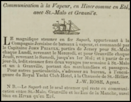 Shortly before she was wrecked, Superb was advertised in Chronique de Jersey as the only vessel operating from Jersey to France in summer and winter