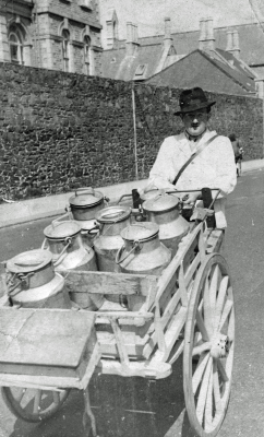 Two pictures of Clarrie Surcouf with the family dairy's carts